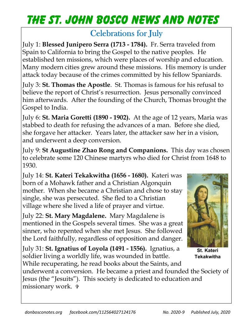 July 1: Blessed Junipero Serra (1713 – 1784). Fr. Serra traveled from Spain to California to bring the Gospel to the native peoples. He established ten missions, which were places of worship and education. Many modern cities grew around these missions. His memory is under attack today because of the crimes committed by his fellow Spaniards.