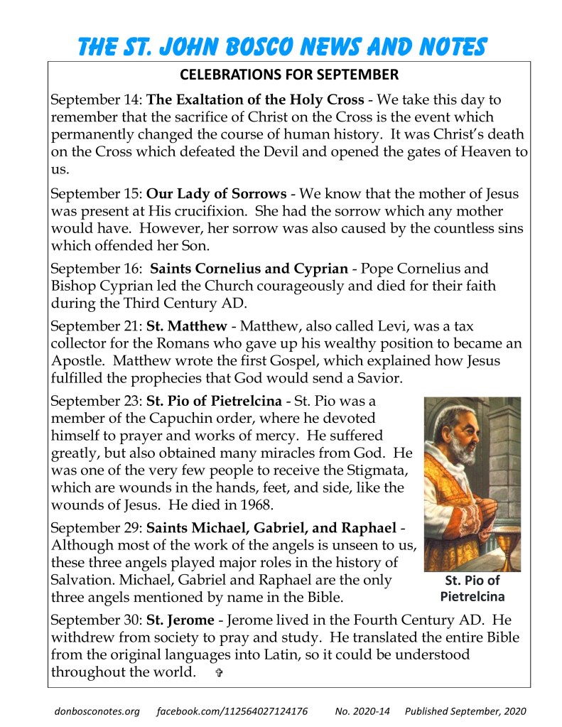 September 23: St. Pio of Pietrelcina – St. Pio was a member of the Capuchin order, where he devoted himself to prayer and works of mercy. He suffered greatly, but also obtained many miracles from God. He was one of the very few people to receive the Stigmata, which are wounds in the hands, feet, and side, like the wounds of Jesus. He died in 1968.
