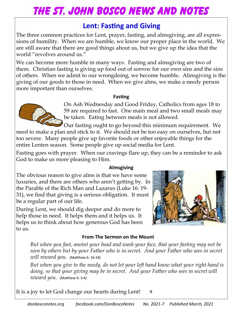 The three common practices for Lent, prayer, fasting, and almsgiving, are all expressions of humility. When we are humble, we know our proper place in the world. We are still aware that there are good things about us, but we give up the idea that the world “revolves around us.”