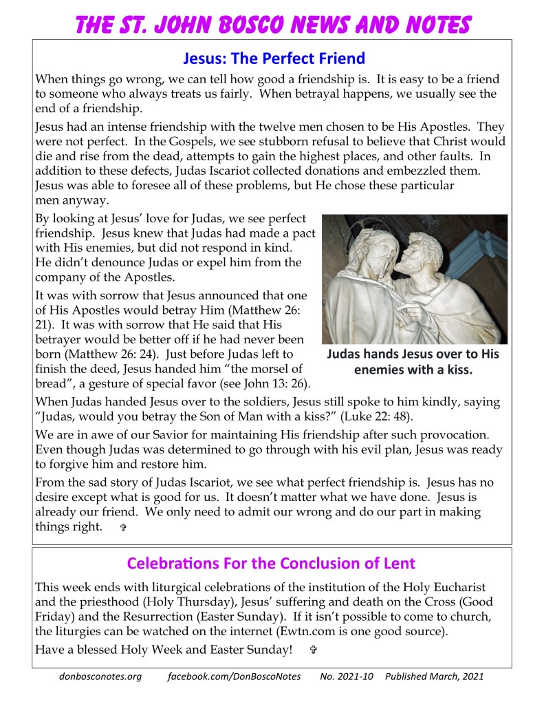 From the sad story of Judas Iscariot, we see what perfect friendship is. Jesus has no desire except what is good for us. It doesn’t matter what we have done. Jesus is already our friend. We only need to admit our wrong and do our part in making things right.