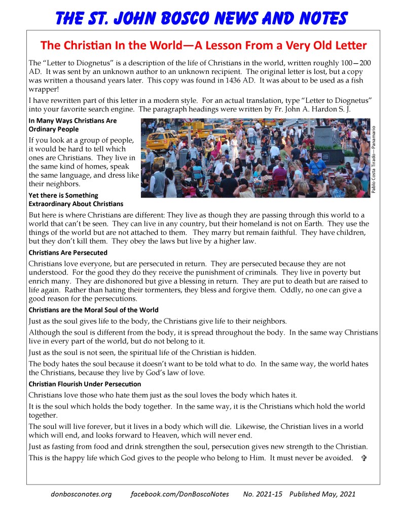 I have rewritten part of this letter in a modern style. For an actual translation, type “Letter to Diognetus” into your favorite search engine. The paragraph headings were written by Fr. John A. Hardon S. J.