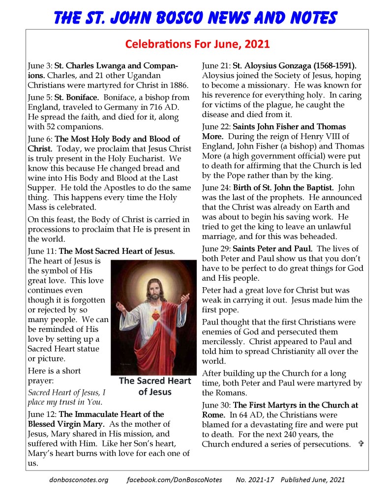June 11: The Most Sacred Heart of Jesus. The heart of Jesus is the symbol of His great love. This love continues even though it is forgotten or rejected by so many people. We can be reminded of His love by setting up a Sacred Heart statue or picture.