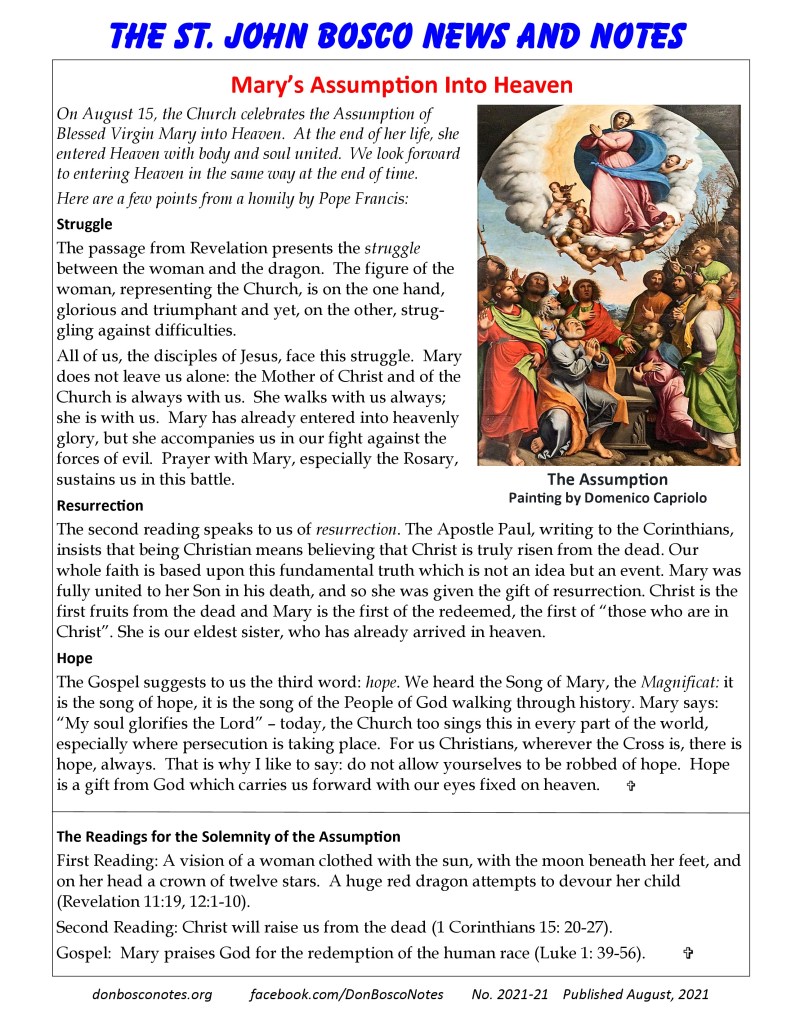 On August 15, the Church celebrates the Assumption of Blessed Virgin Mary into Heaven. At the end of her life, she entered Heaven with body and soul united. We look forward to entering Heaven in the same way at the end of time.
