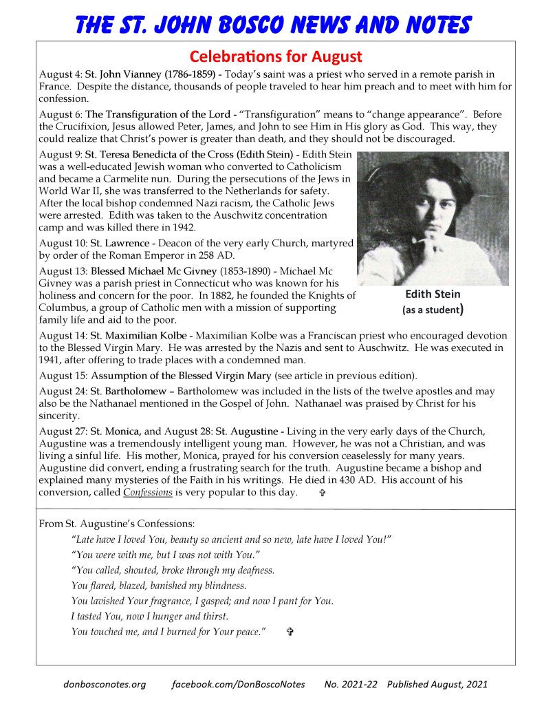 August 9: St. Teresa Benedicta of the Cross (Edith Stein) – Edith Stein was a well-educated Jewish woman who converted to Catholicism and became a Carmelite nun. During the persecutions of the Jews in World War II, she was transferred to the Netherlands for safety. After the local bishop condemned Nazi racism, the Catholic Jews were arrested. Edith was taken to the Auschwitz concentration camp and was killed there in 1942.