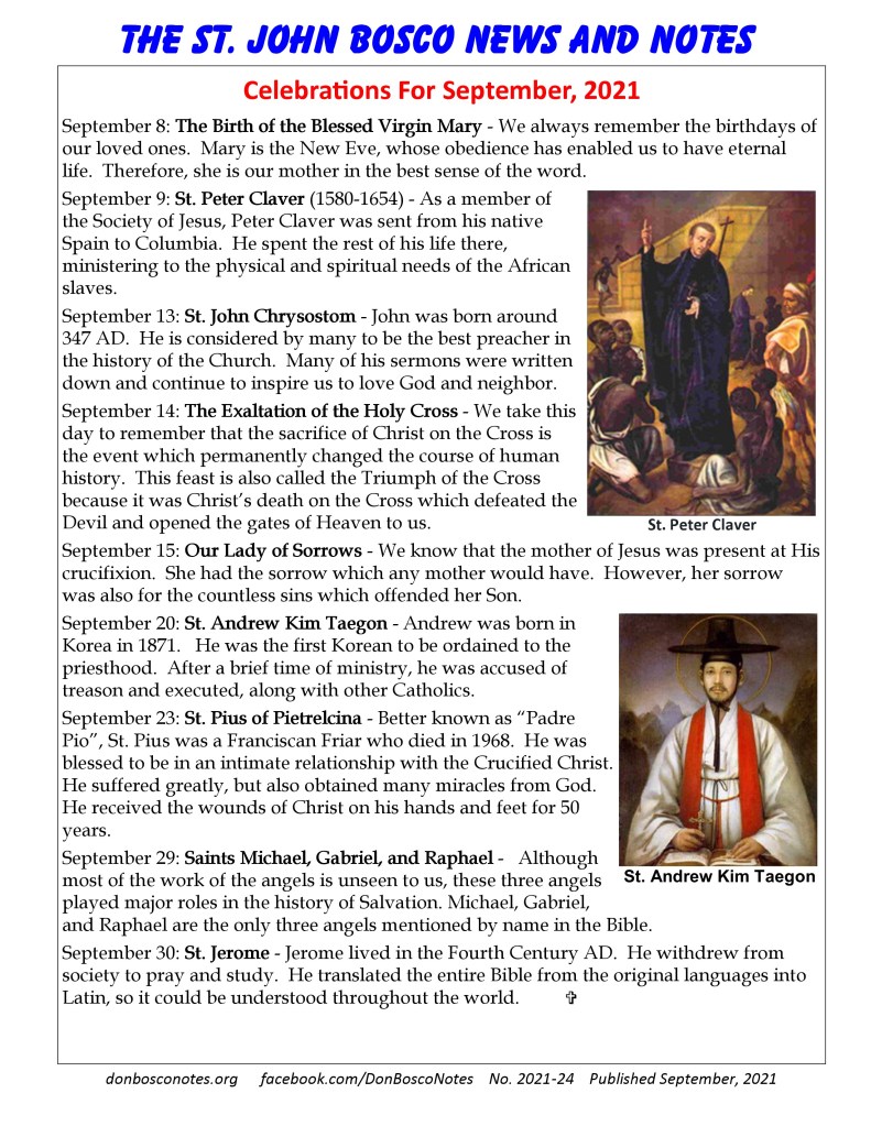 September 13: St. John Chrysostom – John was born around 347 AD. He is considered by many to be the best preacher in the history of the Church. Many of his sermons were written down and continue to inspire us to love God and neighbor.