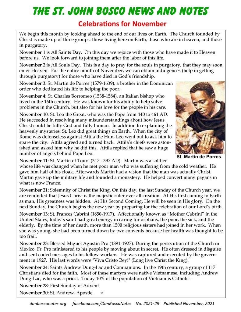 November 3: St. Martin de Porres (1579-1639), a brother in the Dominican order who dedicated his life to helping the poor.