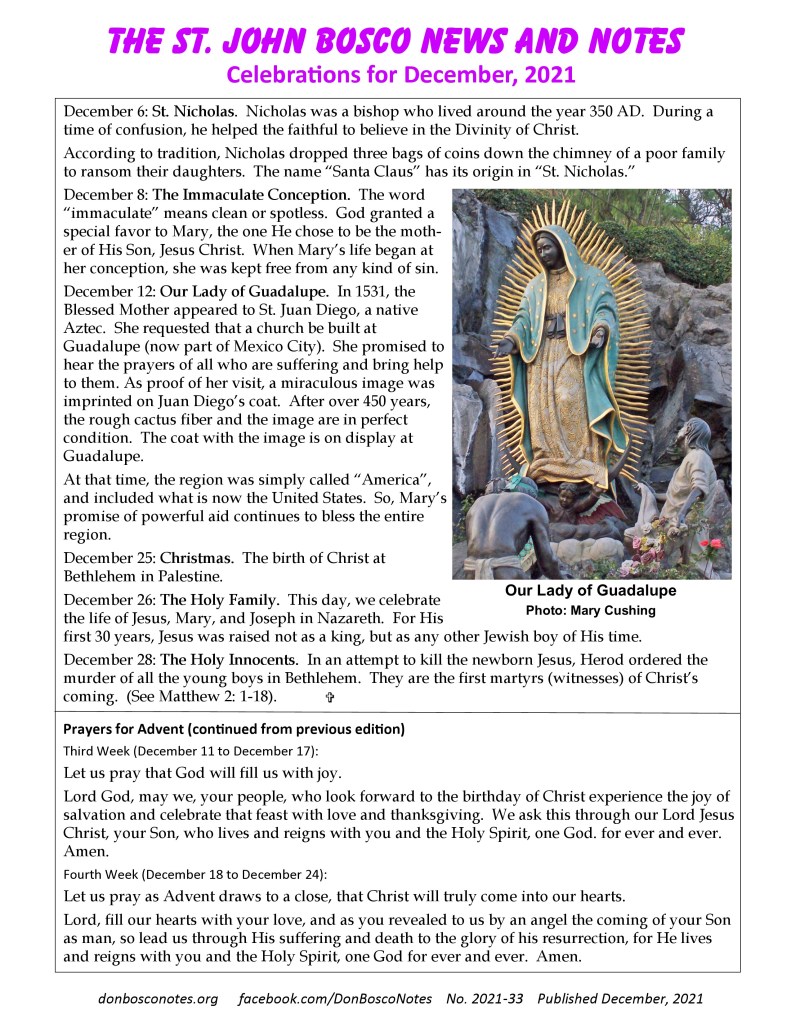 December 12: Our Lady of Guadalupe. In 1531, the Blessed Mother appeared to St. Juan Diego, a native Aztec. She requested that a church be built at Guadalupe (now part of Mexico City). She promised to hear the prayers of all who are suffering and bring help to them. As proof of her visit, a miraculous image was imprinted on Juan Diego’s coat. After over 450 years, the rough cactus fiber and the image are in perfect condition. The coat with the image is on display at Guadalupe.