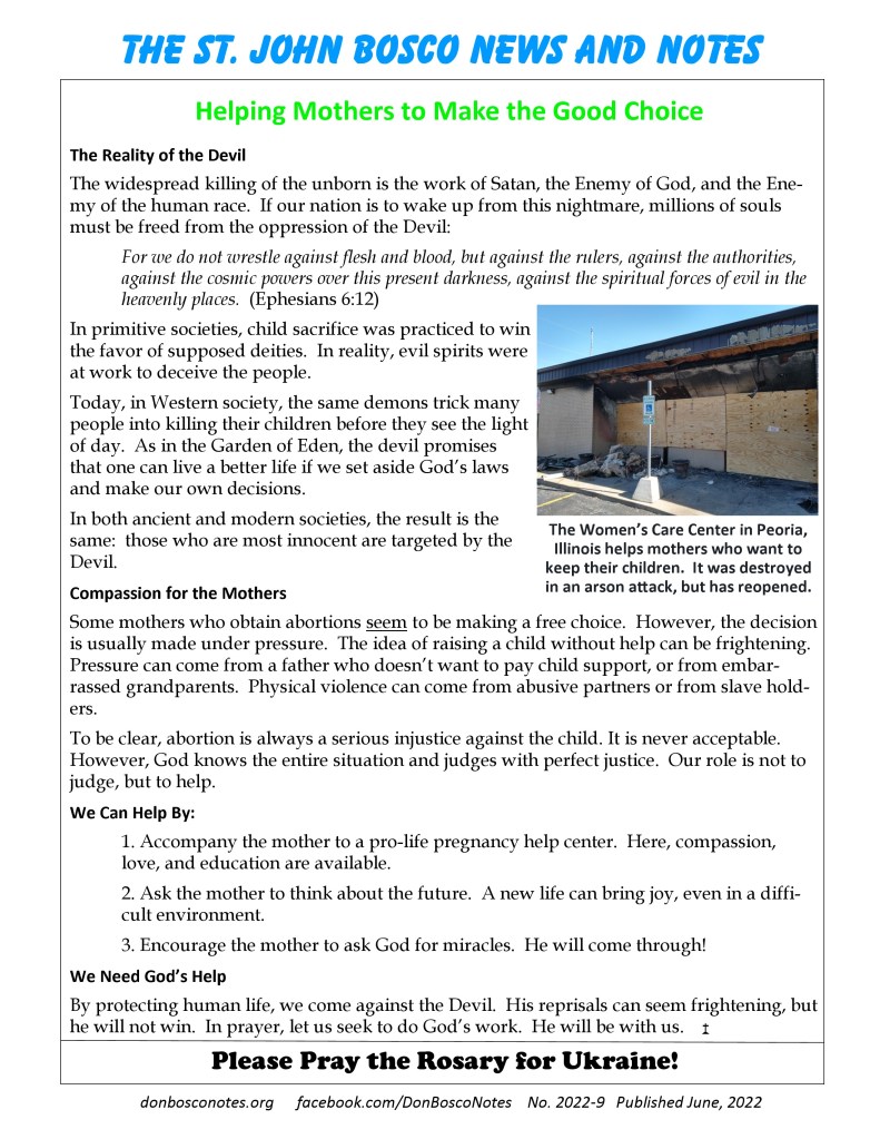 The widespread killing of the unborn is the work of Satan, the Enemy of God, and the Enemy of the human race. Abortion is a serious injustice against the child. Our role, however, is not to judge but to help.