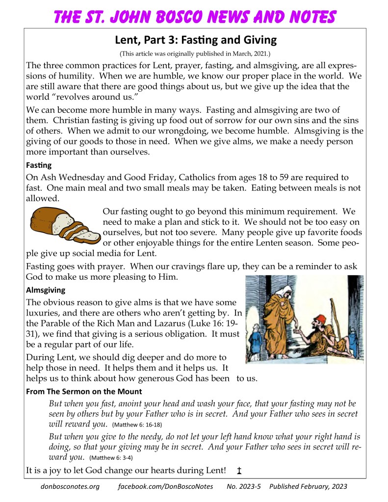 The three common practices for Lent, prayer, fasting, and almsgiving, are all expressions of humility.  When we are humble, we know our proper place in the world.  We are still aware that there are good things about us, but we give up the idea that the world “revolves around us.”
