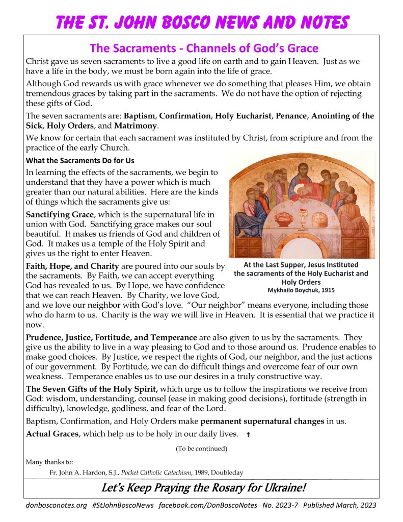 Faith, Hope, and Charity are poured into our souls by the sacraments. By Faith, we can accept everything God has revealed to us. By Hope, we have confidence that we can reach Heaven. By Charity, we love God, and we love our neighbor with God’s love. “Our neighbor” means everyone, including those who do harm to us. Charity is the way we will live in Heaven. It is essential that we practice it now.
