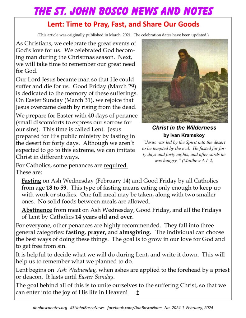 Fasting on Ash Wednesday (February 14) and Good Friday by all Catholics from age 18 to 59. This type of fasting means eating only enough to keep up with work or studies. One full meal may be taken, along with two smaller ones. No solid foods between meals are allowed.
