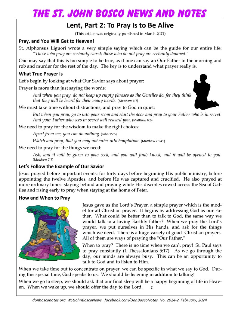 Jesus gave us the Lord’s Prayer, a simple prayer which is the model for all Christian prayer. It begins by addressing God as our Father. What could be better than to talk to God, the same way we would talk to a loving Earthly father? When we pray the Lord’s prayer, we put ourselves in His hands, and ask for the things which we need. There is a huge variety of good Christian prayers. All of them are ways of praying the “Our Father.”