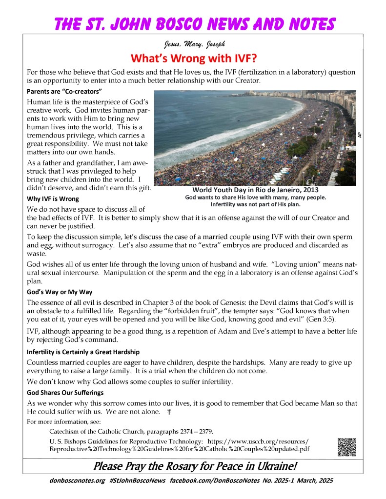 For those who believe that God exists and that He loves us, the IVF (fertilization in a laboratory) question is an opportunity to enter into a much better relationship with our Creator.
