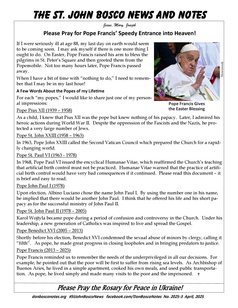 If I were seriously ill at age 88, my last day on earth would seem to be coming soon. I may ask myself if there is one more thing I ought to do. On Easter, Pope Francis raised his arm to bless the pilgrims in St. Peter’s Square and then greeted them from the Popemobile. Not too many hours later, Pope Francis passed away.